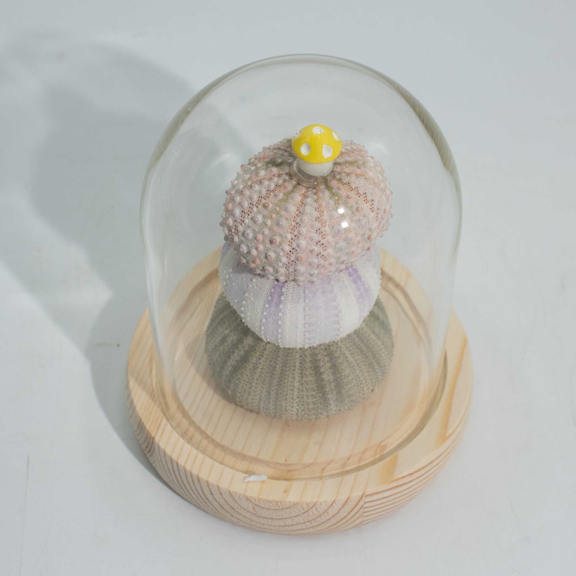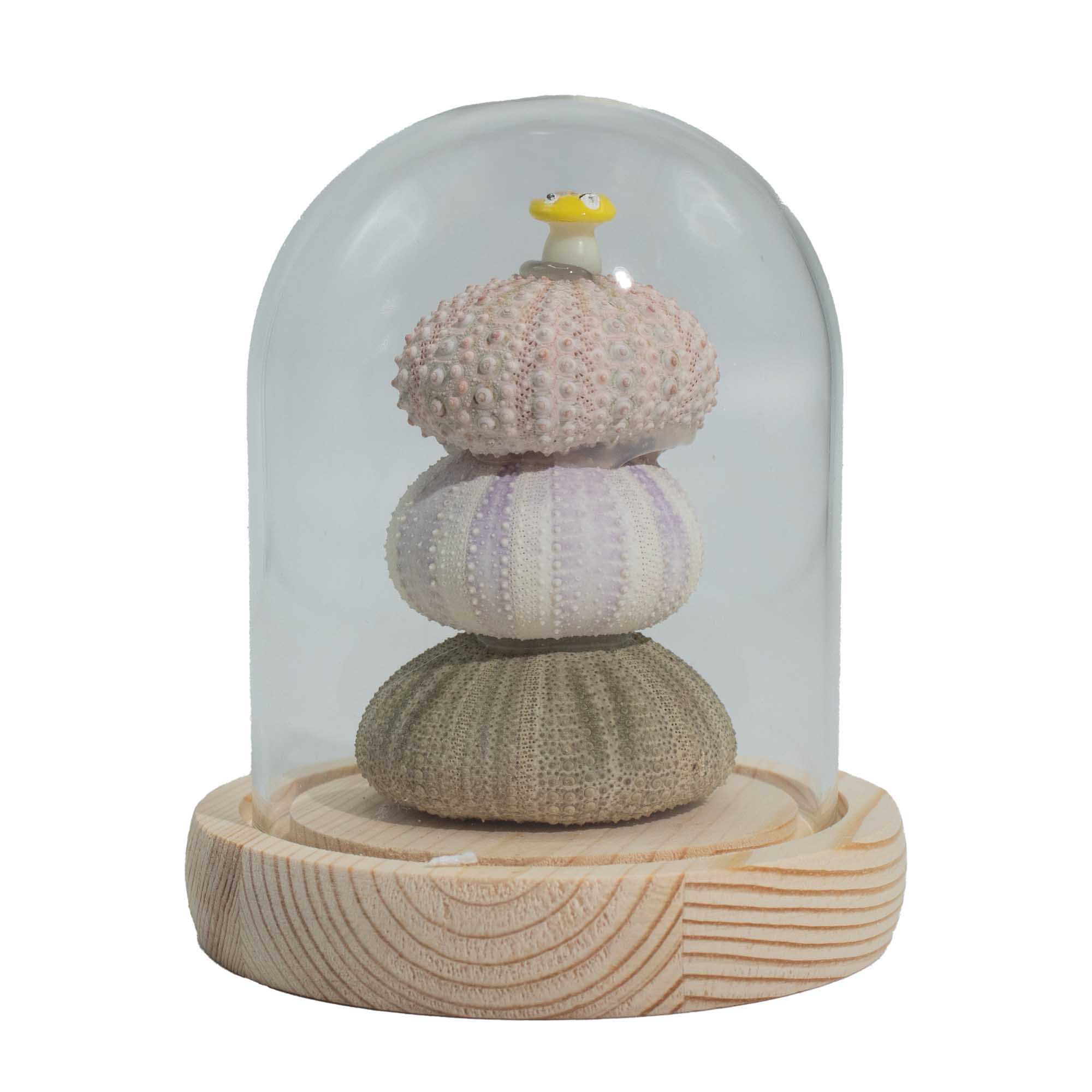 Encased within a clear dome, the trio of sea urchin forms creates a miniature illuminated scene, with warm LED light revealing their intricate textures and geometric shapes for a refined, contemporary effect.