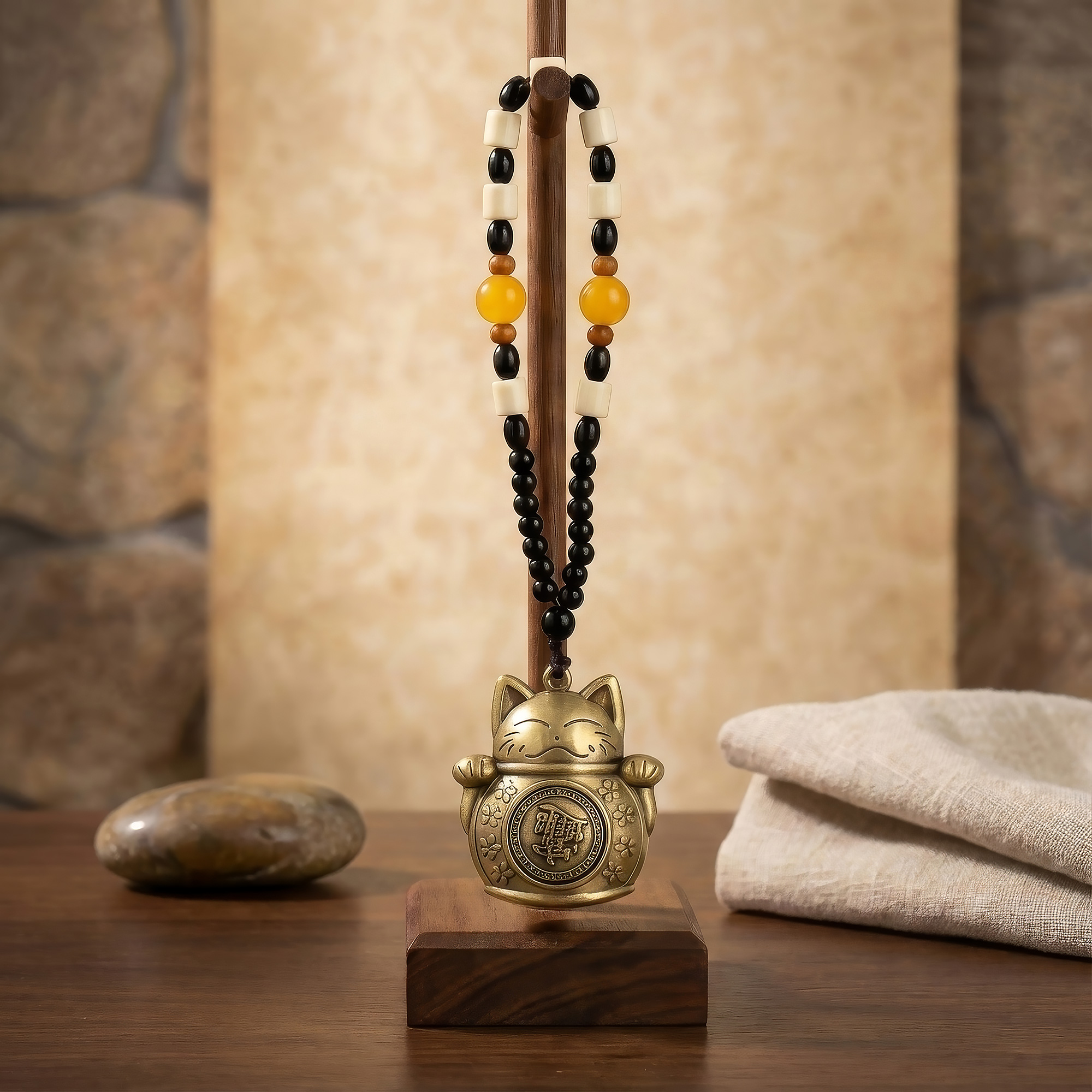 Both decorative and symbolic, this hanging piece is ideal for entrances, shops, offices, cash areas, or wealth corners to encourage success and steady growth. It is suspended from a beaded hanging cord combining black, cream, amber-toned, and wooden beads, creating visual balance and an elegant, harmonious display.