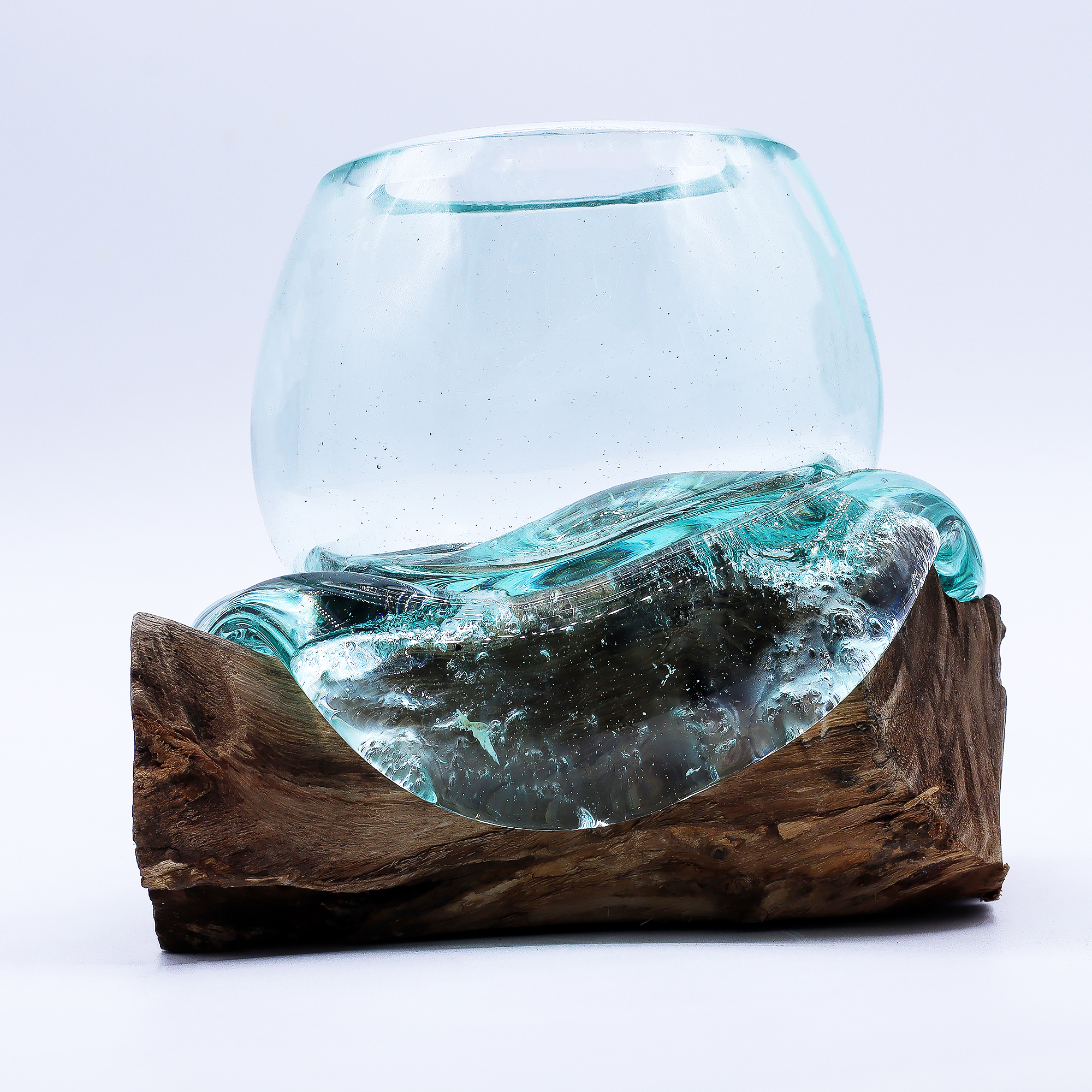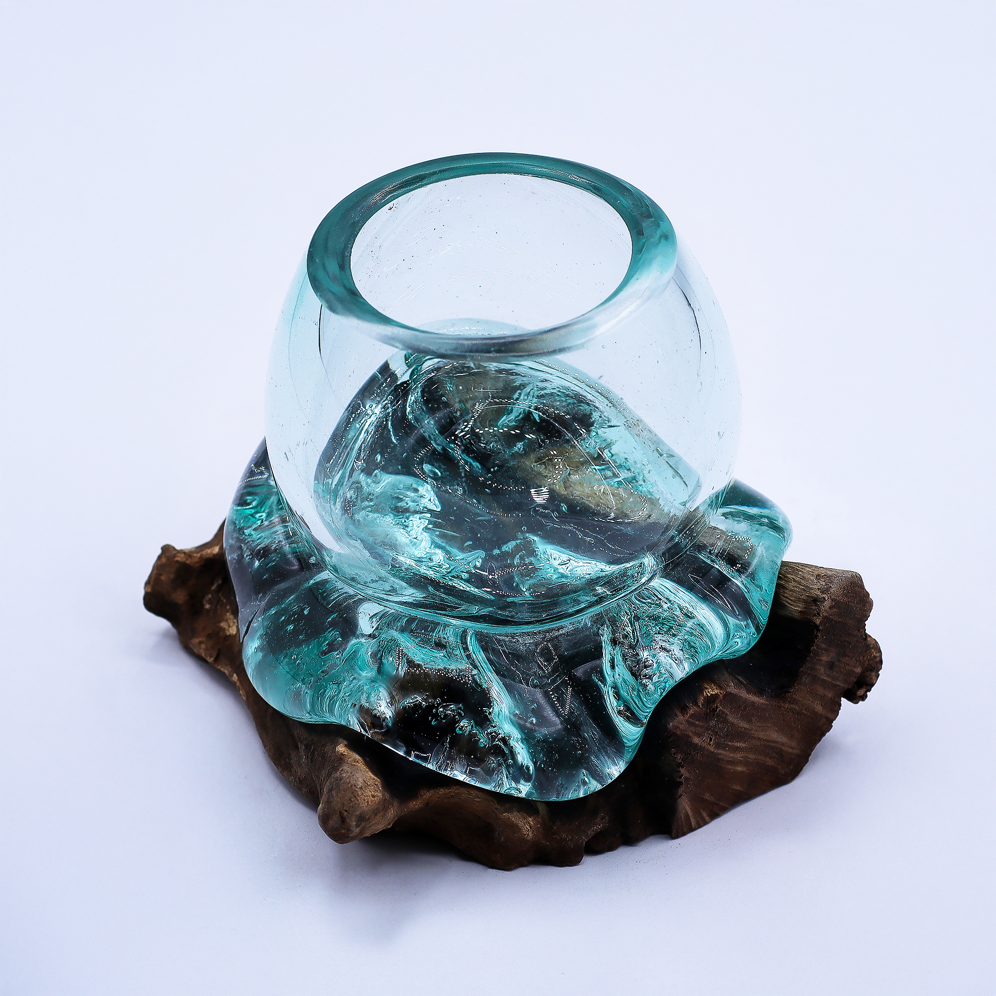 Bring a touch of nature and craftsmanship to your collection with the Mini Molten-Glass Bowl on Wood. Produced in Bali using recycled glass melted directly onto sustainable Gamal wood, each piece is truly unique. As the hot glass settles naturally over the base, it forms exclusive organic shapes that blend artistry with functionality.