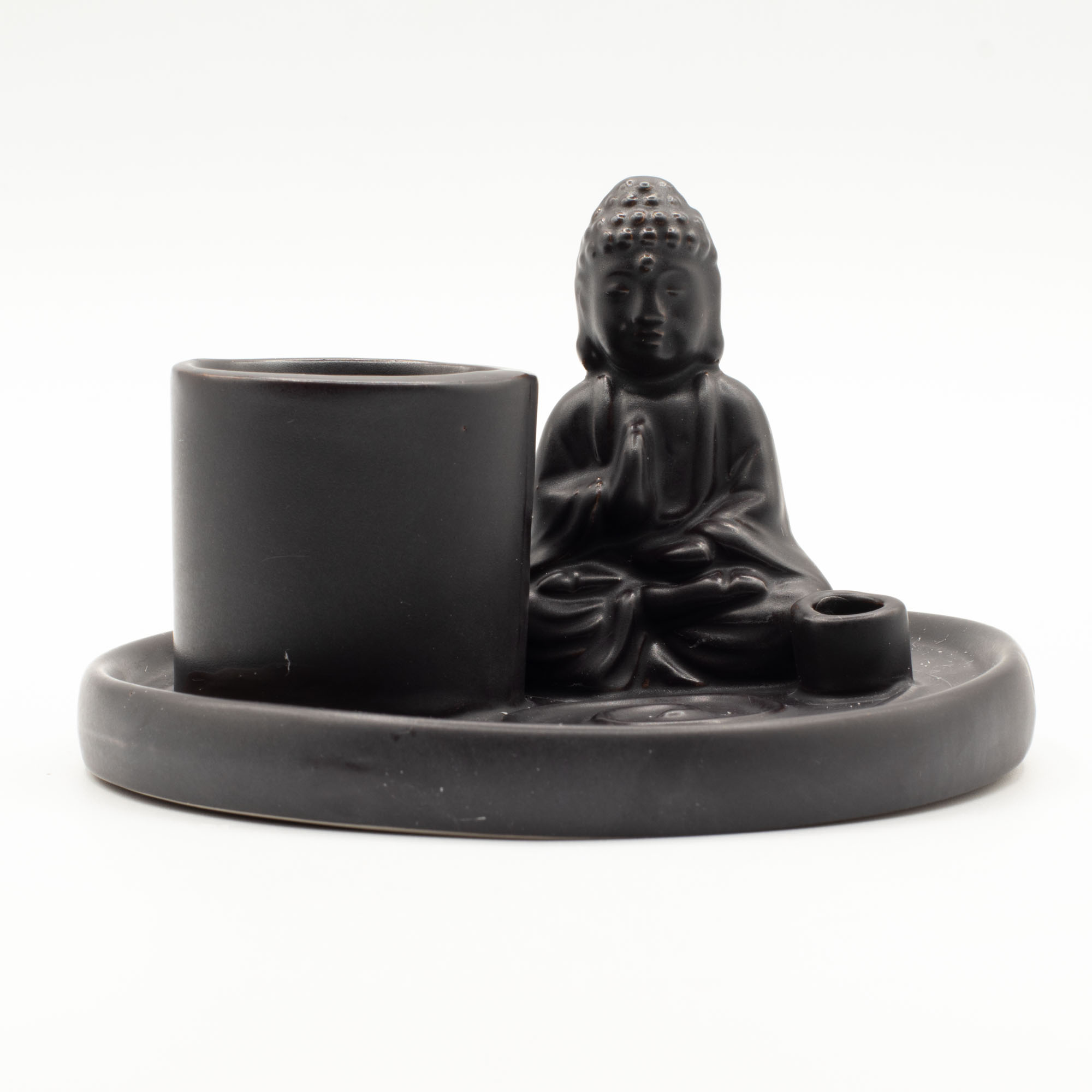 The design features a seated Buddha in a prayer pose, set on a smooth circular plate with integrated holders for incense sticks and cones. The matt black finish absorbs light rather than reflecting it, giving the piece a sculptural, contemporary feel that works beautifully in modern interiors, wellness spaces, and monochrome décor themes.