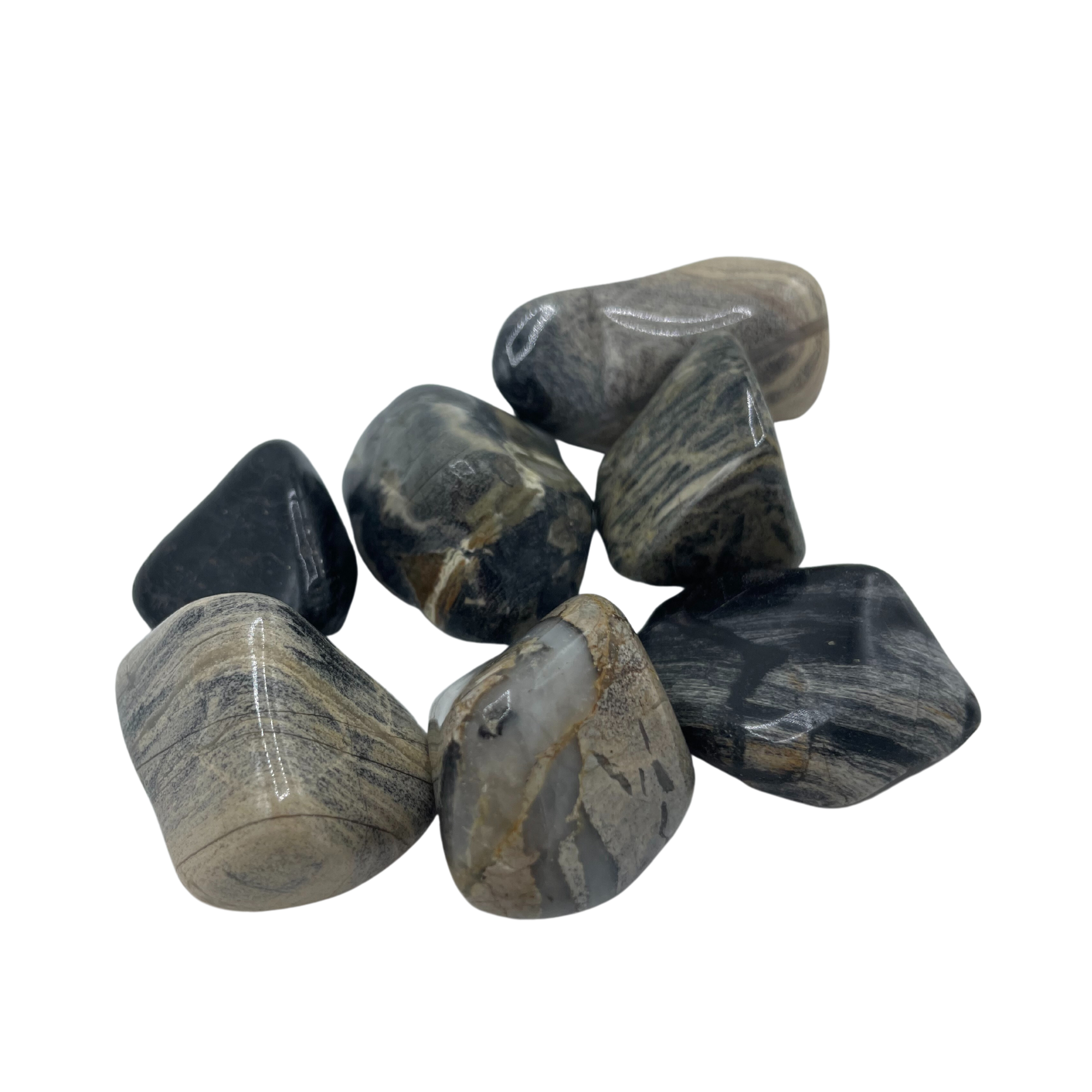 Silverleaf tumble stones are small, polished gemstones made from a variety of minerals that feature a distinctive silver and white marbled pattern. These stones are often used for decorative purposes, as well as for their purported spiritual and healing properties.