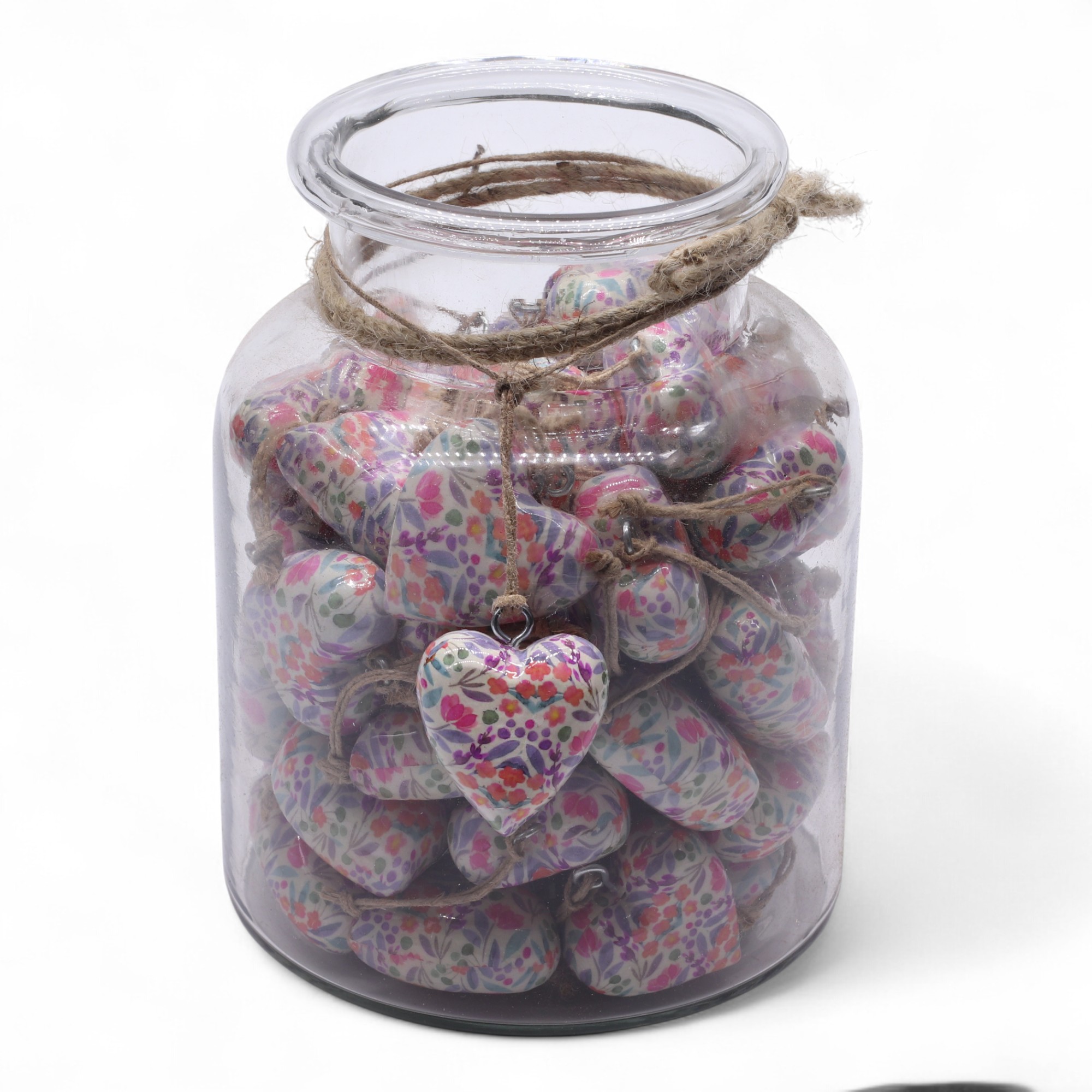 Beautifully arranged in a clear display jar containing 50 pieces, each heart showcases a smooth, enamel-style surface that enhances its lively botanical artwork.