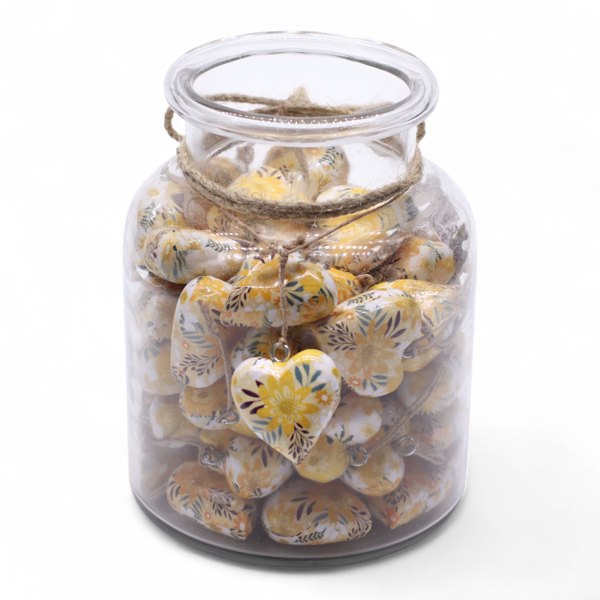 Brighten any display with these Large Decorative Wooden Hearts adorned in a cheerful Yellow Floral design. Neatly showcased in a clear display jar containing 50 pieces, each heart features a smooth, enamel-style finish that highlights its sunny colour palette and charming botanical artwork.